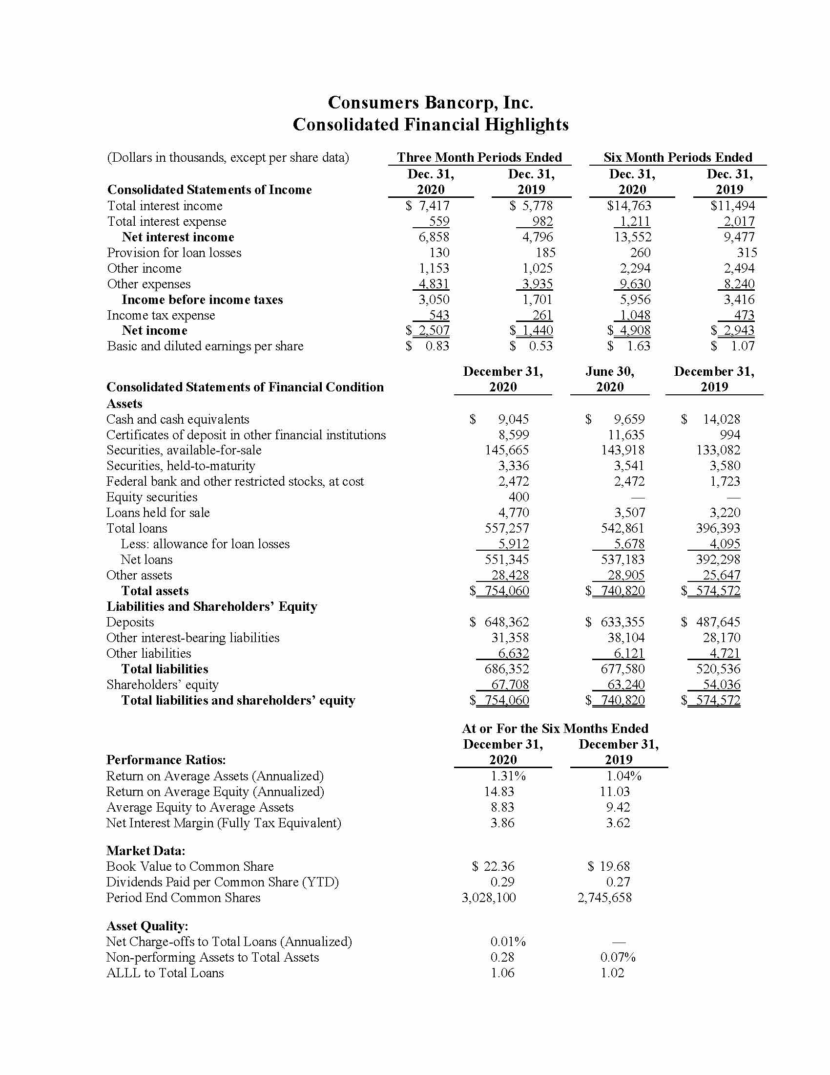 Minerva, Ohio—January 20, 2021 (OTCQX: CBKM) Consumers Bancorp, Inc. (Consumers) today reported net income of $2.5 million for the second quarter of fiscal year 2021, an increase of $1.1 million, or 74.1%, from the same period last year. Earnings per share for the second quarter of fiscal year 2021 were $0.83 compared to $0.53 for the same period last year. Net income for the three months ended December 31, 2020 was positively impacted by a $2.1 million, or 43.0%, increase in net interest income, which was primarily the result of a $182.9 million increase in average interest-earning assets from the same prior year period. The increase in average interest-earning assets was primarily a result of the merger with Peoples Bancorp of Mt. Pleasant, Inc. (Peoples), which closed on January 1, 2020, and from the addition of Small Business Administration’s (SBA) Paycheck Protection Program (PPP) loans.